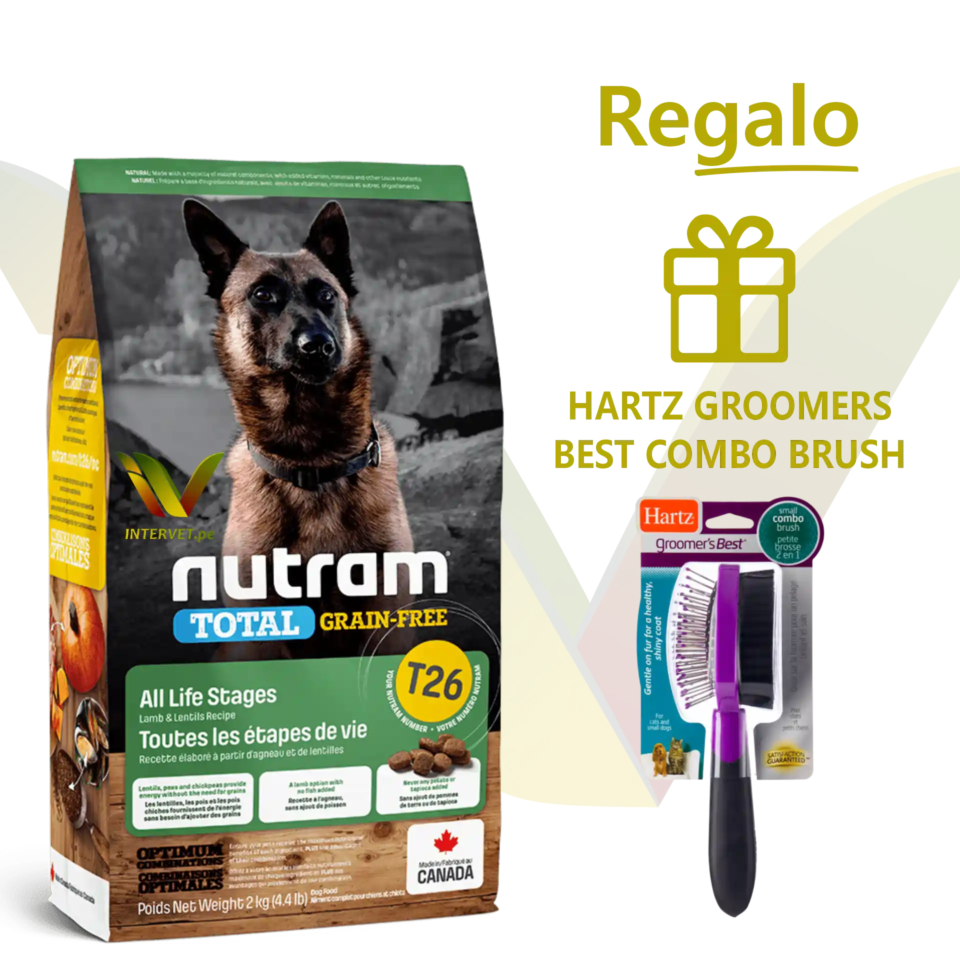 Cordero deshuesado (19,5 %), carne deshidratada de cordero, lentejas (13,0 %), arvejas verdes (13,0 %), garbanzos (12,0%), aceite de canola, proteína de arvejas, sabor natural, linaza (1,8 %), manzanas, zapallo, calabaza (0,55 %), brócoli, quinua, sal marina marina, raíz de achicoria, algas marinas, biotina, yucca schidigera, mejillón de labios verdes (0,05 %), romero, vitaminas y minerales quelados.